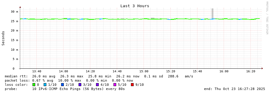 11 > 2001:4350:0:1010::3 (2001:4350:0:1010::3) [AS5438] 26.507ms 26.170ms 26.373ms